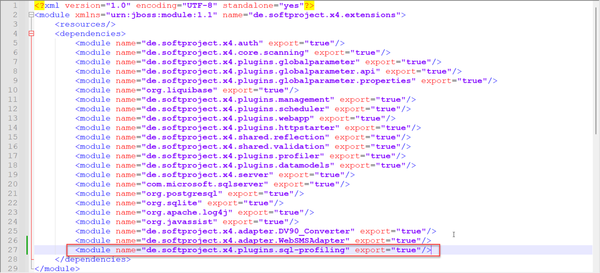 module.xmlfolgende Zeile hinzu:<module name="de.softproject.x4.plugins.sql-profiling" export="true"/>Die Datei sollte folgendermaßen aufgebaut sein: