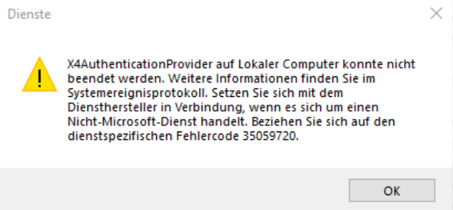 Wenn Sie das Kontrollkästchen Install X4 Server as Service aktivieren, um den X4 Server als Dienst zu installieren, und den Keycloak-Dienst X4AuthenticationProvider manuell über den Windows-Taskmanager beenden möchten, wird möglicherweise diese Meldung angezeigt: