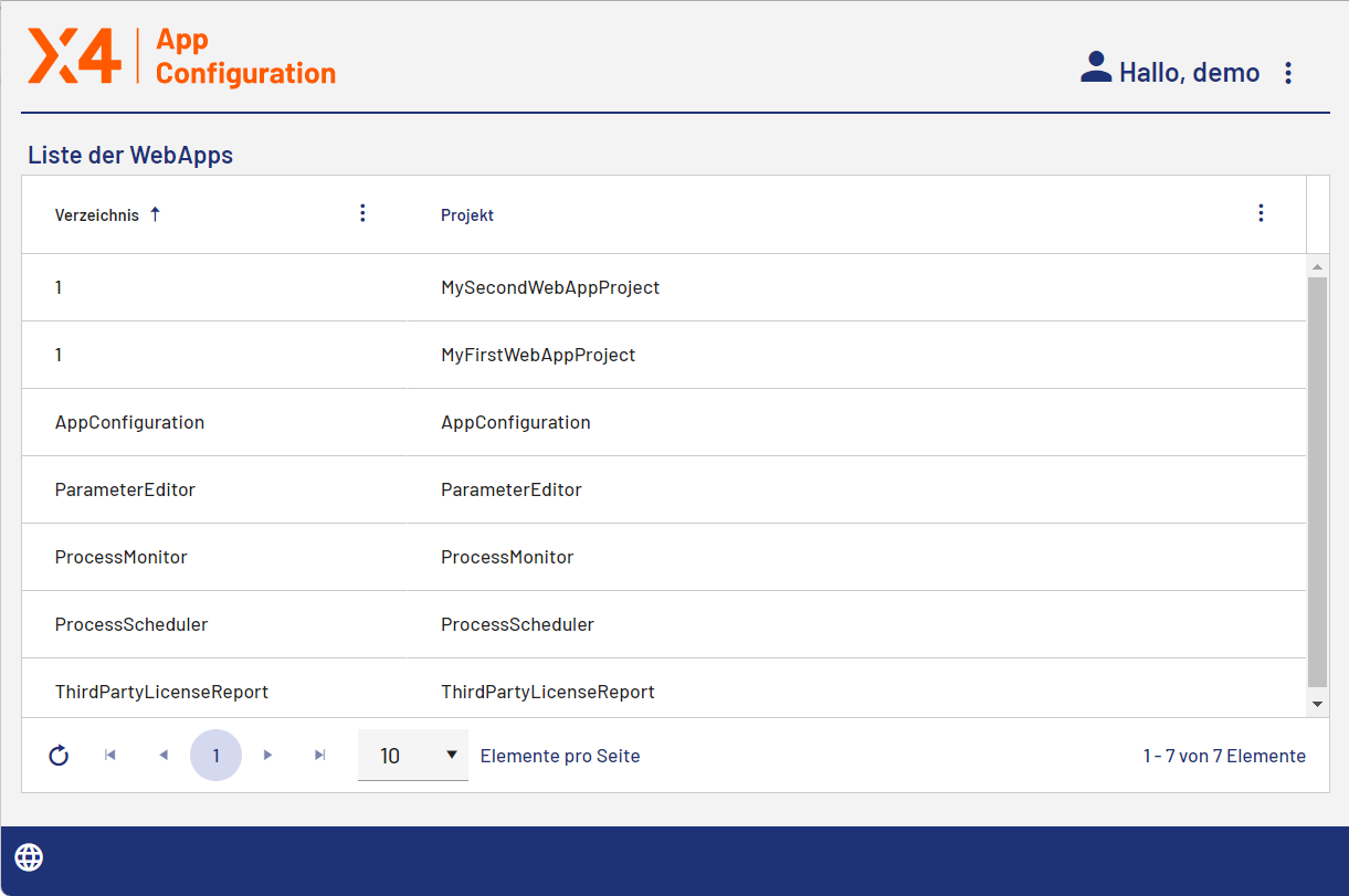 Beim Öffnen der App wird eine Liste der Web Apps angezeigt, die in der ausgeführten Instanz der X4 BPMS vorhanden sind. Dazu gehören die vorkonfigurierten X4 Web Apps sowie alle Web Apps, die Sie selbst im X4 Designer erstellen.