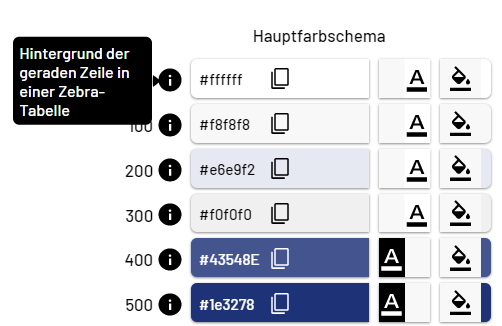 Wenn Sie den Mauszeiger über das Infosymbol rechts neben einer Farbnummer bewegen, sehen Sie, wofür die jeweilige Farbe in der Web App verwendet wird. |