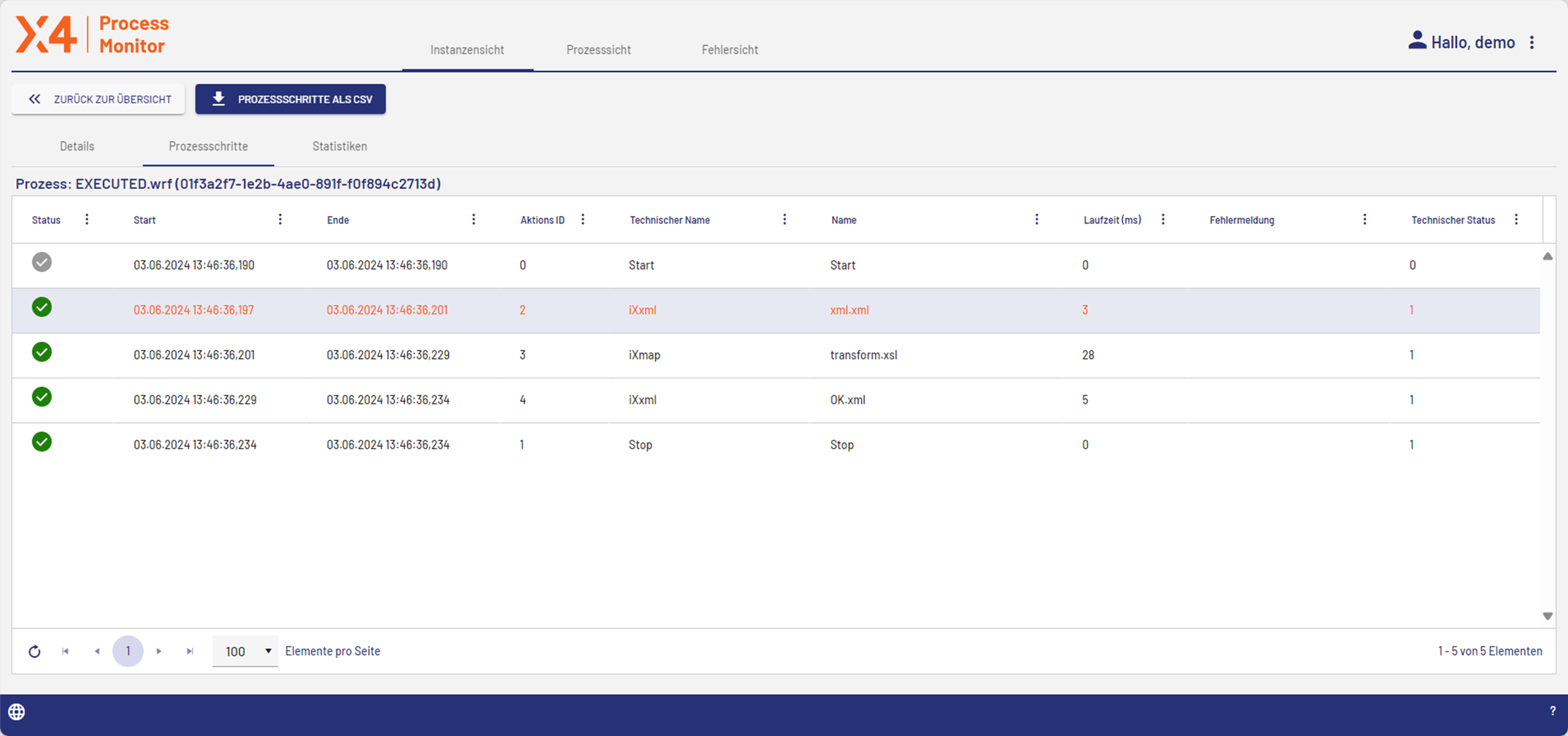 Die Registerkarte Prozessschritte enthält eine Übersicht über die Prozessschritte der ausgewählten Prozessinstanz mit den folgenden Informationen: