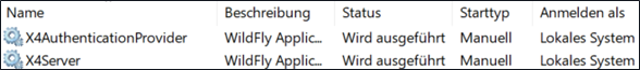 Im Dialogfenster Dienste wird eine Liste aller auf Ihrem System ausgeführten Windows-Dienste angezeigt. In dieser Liste sehen Sie auch die Dienste X4 Server und X4AuthenticationProvider. Überprüfen Sie den Status dieser beiden Dienste.