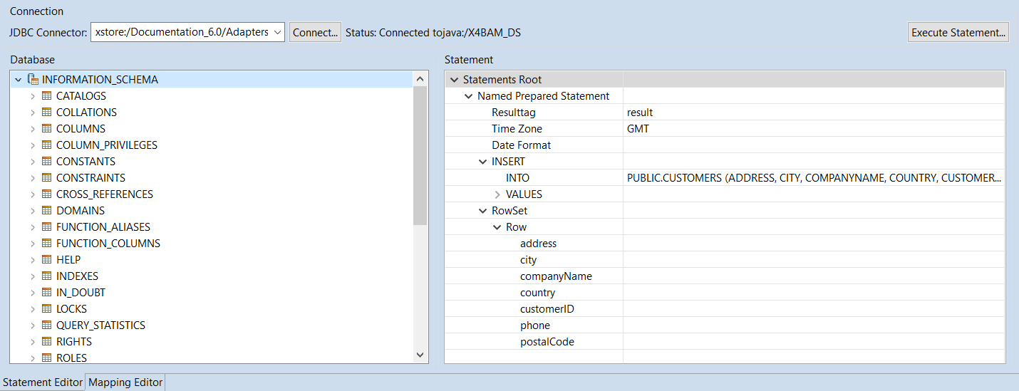 Mit dem Mapping Editor können Sie für die zuvor im Statement Editor angelegten Statements per Drag&Dropp Mappings von einem Input-XML-Dokument auf die Named Parameters der Statements konfigurieren und anschließend erstellen. Diese Mappings erzeugen mit einem passenden Input-XML-Dokument eine dynamisch erzeugte Eingabe für den (7.4.0-de) JDBC Connector.