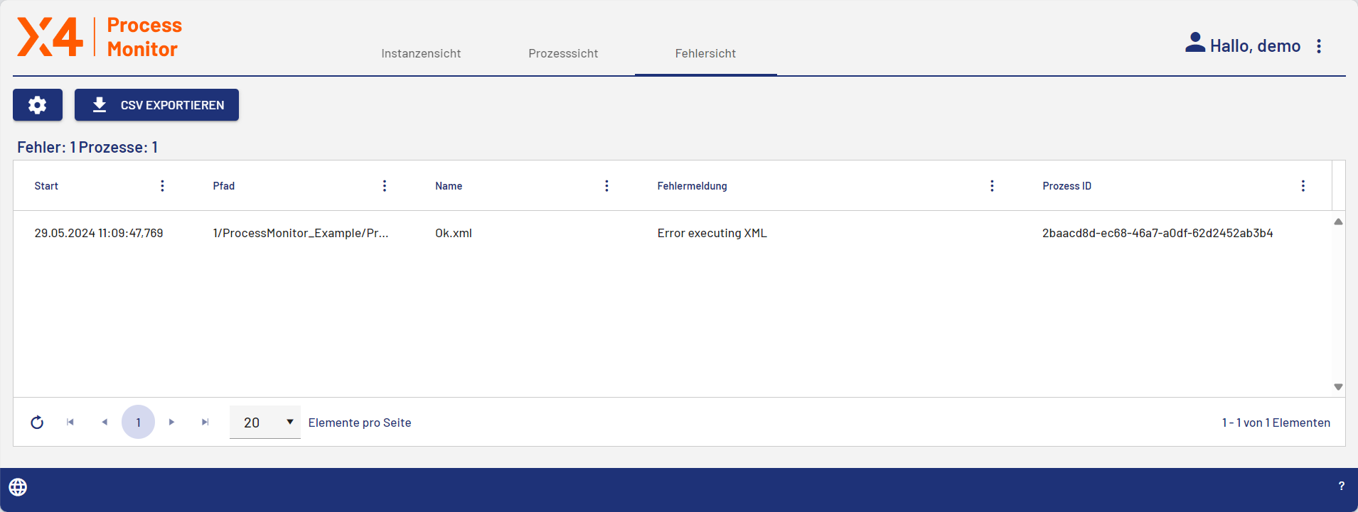 Auf der Registerkarte Fehlersicht werden alle fehlerhaften Prozessschritte in einer Übersicht angezeigt.