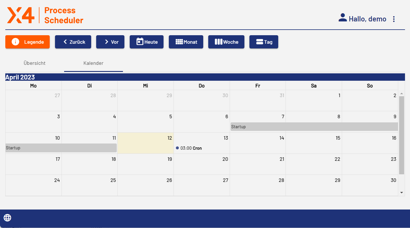 Auf der Registerkarte Kalender sehen Sie die festgelegten Ausführungszeitpunkte Ihrer geplanten Prozesse in einer Kalenderansicht.