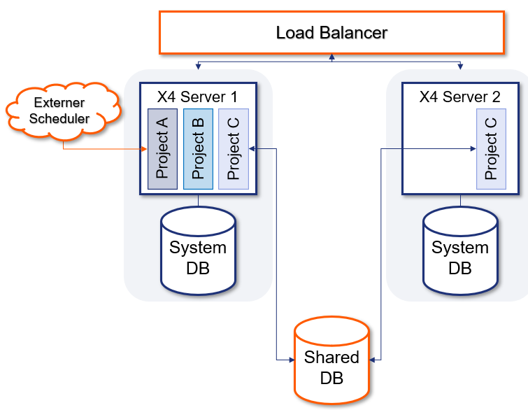 Soll das Scheduling unabhängig von der laufenden Lastverteilung geschehen, wird ein dedizierter X4 Server eingerichtet, auf dem nur die automatisch gestarteten Prozesse installiert sind. Diese X4 Server-Instanz hat die Möglichkeit, über die geteilte Datenbank die anderen X4 Systeme zu benachrichtigen. Hierbei gibt es, wie im Abschnitt Szenario – Gemeinsamer Zugriff über Message Queue angegeben, auch die Möglichkeit, Nachrichten über eine Message Queue mit der geteilten Datenbank auszutauschen.