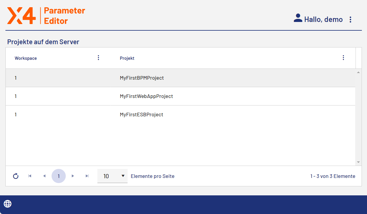Beim Öffnen der App wird eine Liste aller Projekte angezeigt, für die Sie im X4 Designer eine .param-Datei angelegt haben, um über die Project Parameter Configuration Projekt-Parameter zu konfigurieren. Weitere Informationen hierzu finden Sie im ESB-Handbuch > Parameter erstellen und verwenden > Projekt-Parameter.