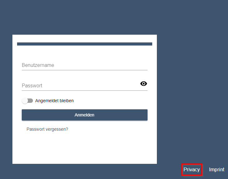 Auf der Login-Seite sowie auf allen Seiten innerhalb der Web-Anwendung wird ein Link zur Datenschutzerklärung angezeigt. Der Link wird nur angezeigt, wenn auch eine .dpr-Datei innerhalb des Web App-Projekts vorhanden ist.