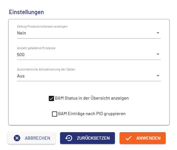 ) auswählen, wird das Dialogfenster Einstellungen geöffnet. Hier können Sie verschiedene Einstellungen für die Anzeige der Prozessinstanzen festlegen.