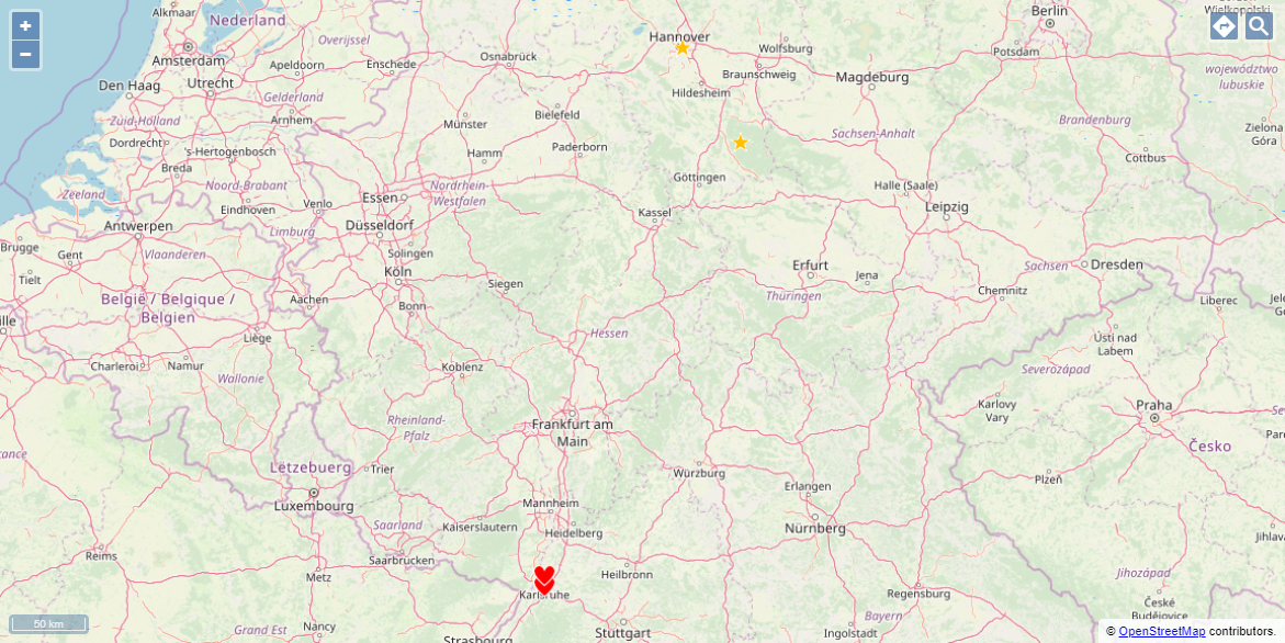 In diesem Beispiel werden zwei Gruppen von Markern eingeblendet sowie die Suche und Routenberechnung aktiviert.