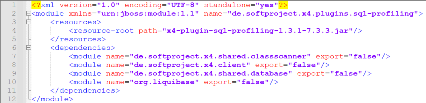module.xmlfolgende Zeile hinzu:<module name="de.softproject.x4.plugins.sql-profiling" export="true"/>Die Datei sollte folgendermaßen aufgebaut sein: