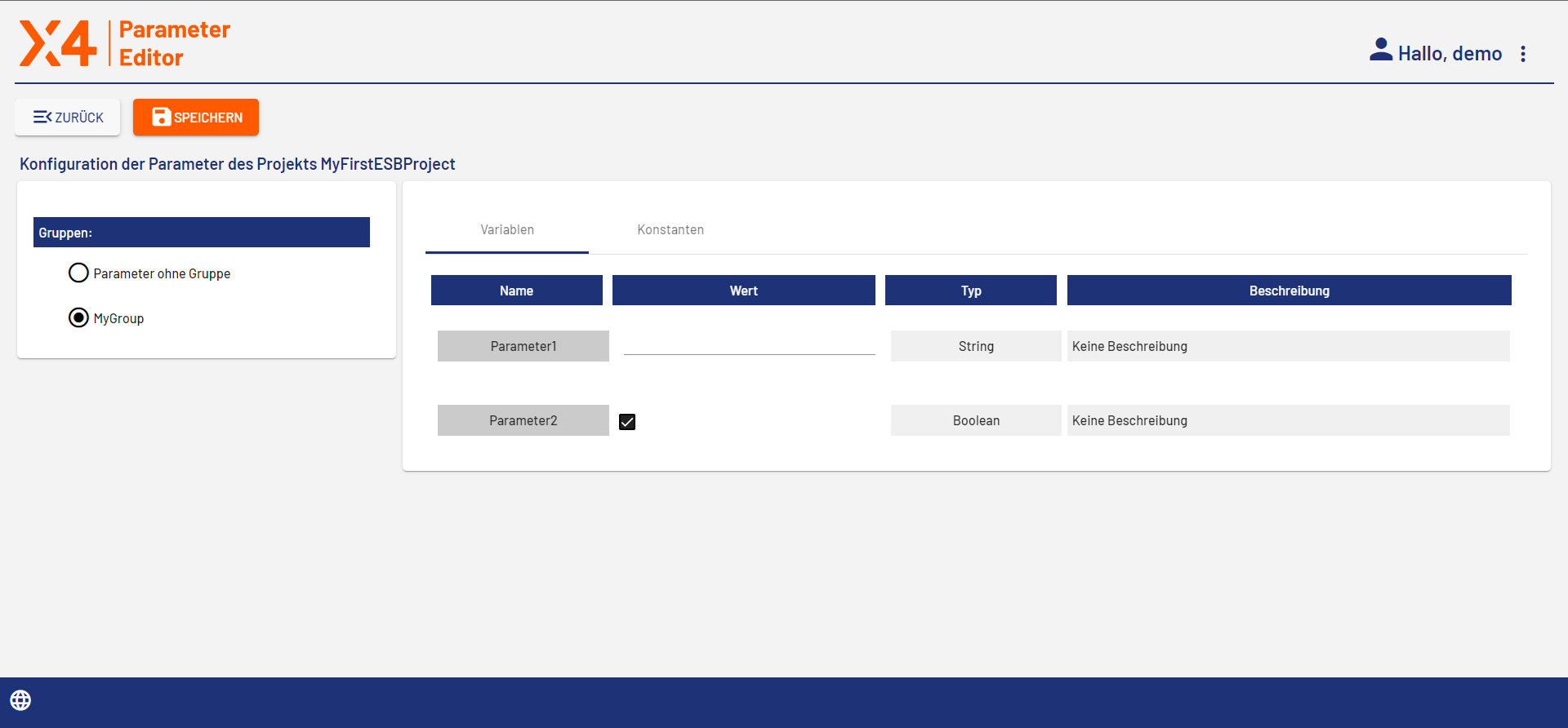 Sie können den Wert für alle Projekt-Parameter ändern, für die Sie im X4 Designer in der .param-Datei das Kontrollkästchen Changeable aktiviert haben. Damit haben Sie festgelegt, dass der Parameter den Typ Variable haben soll.