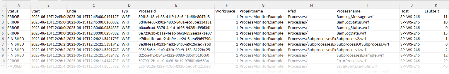 Über die Schaltfläche CSV exportieren können Sie die aufgelisteten Prozessinstanzen als CSV-Datei herunterladen. Diese CSV-Datei bietet eine komfortable Möglichkeit, eine Liste der überwachten Prozesse lokal zu speichern und weiterzugeben. Die Datei enthält alle Prozessinformationen, die auch im X4 Process Monitor angezeigt werden.
