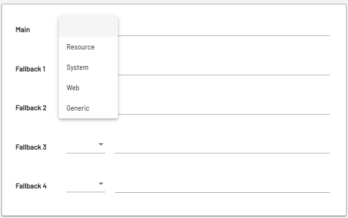 Wenn Sie auf Bearbeiten geklickt haben, können Sie sowohl für die Hauptschriftart (Main) als auch für die verschiedenen Ersatzschriftarten (Fallback) eine der folgenden Optionen aus der Dropdown-Liste auswählen.