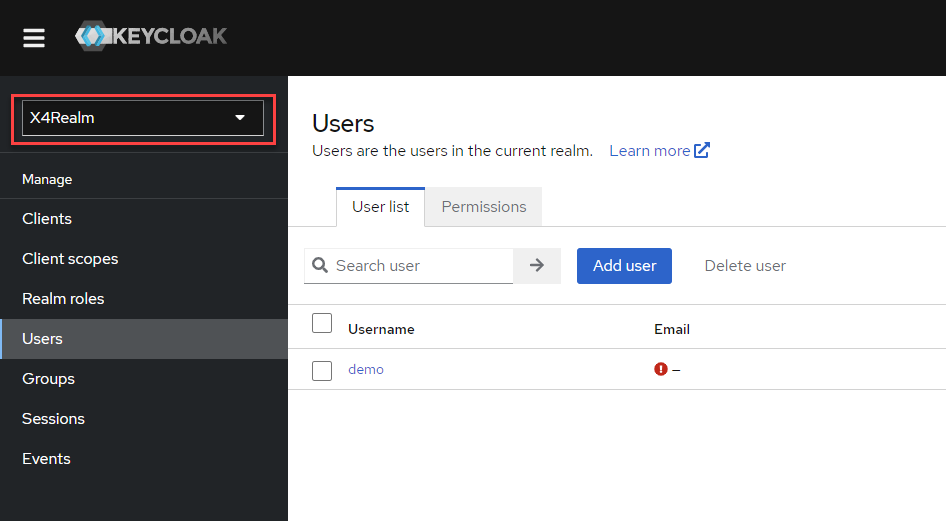 Das X4 Control Center hat eine Kachel Administation mit einem Link zum User Management in Keycloak. Dieser Link wurde so angepasst, dass er direkt zum User Management im konfigurierten X4Realm führt:
