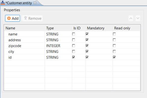 In addition to the Design view shown above you can also open the .entity file in the Source view and define the properties as XML elements and the corresponding attributes.