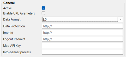 Note: This setting cannot be changed at runtime. Data Protection: In this field, you can link external pages as privacy policy. Imprint: In this field, you can link external pages as imprint. Logout Redirect: In this field, you can redirect users to the specified URL after logout. You can enter any valid URL with any valid protocol ( Map API Key: When using Google Maps as a map provider, the folllowing APIs must be enabled:
