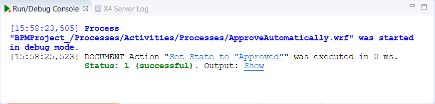 For each executed process step, an entry is displayed in the Run/Debug Console view. Error messages are highlighted in red, successful status messages are green. In addition, a temporary output file is created for each step, which you can view by clicking the corresponding link.