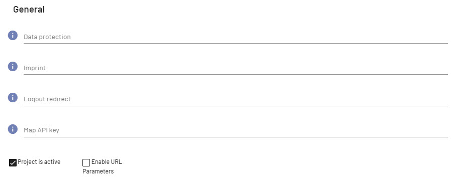 ![]() | Data protection: Linking external Data privacy policy pages. Imprint: Linking external Imprint pages. Logout redirect: Redirecting users to the specified URL when logging out of the system. You can enter any valid URL with any valid protocol ( Map API key: If Google Maps is used as a map provider, the following APIs need to be activated: