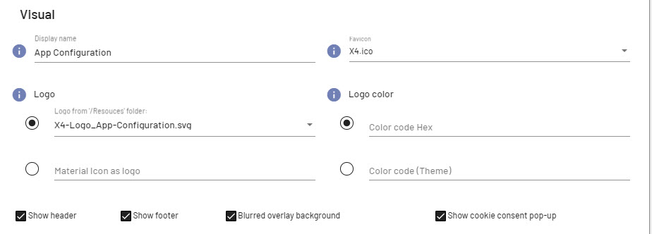 Logo color: This field defines the color of the logo which was added in the field Logo as Material icon. You can either use a hexadecimal color code (e.g. The color if graphic files cannot be changed. Note: