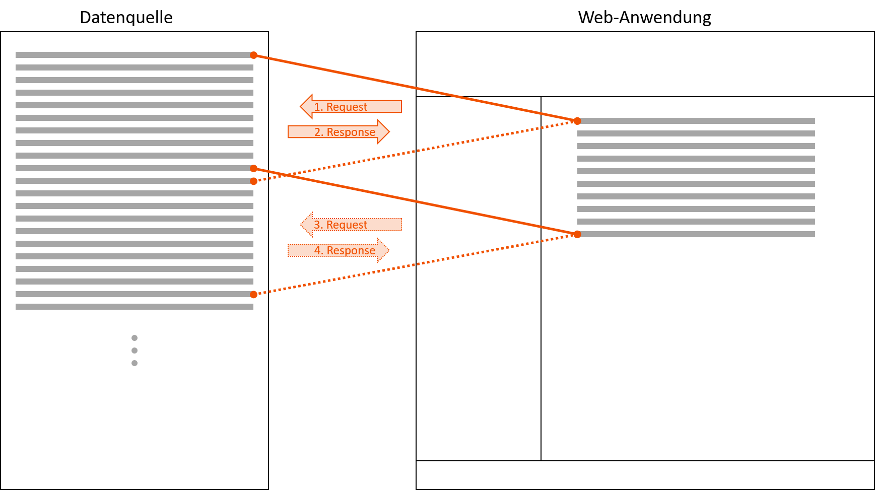 With paging, data is only loaded in subsets from the data source step by step. This avoids large data streams that are very difficult to process by the data source or the browser. Unlike conventional Web applications, Web applications created with X4 Activities Web Apps make it possible to reload the new data while scrolling. The user does not have to explicitly turn to the next page.