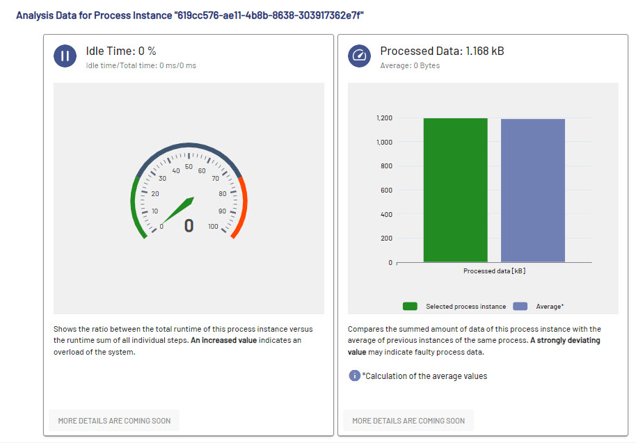 Displays statistic data and KPIs for the selected process instance on the Idle Time and Processed Data tabs. |