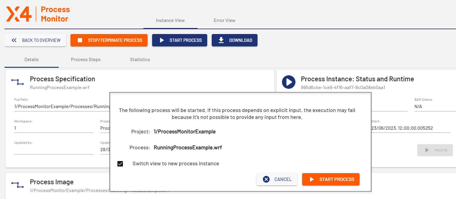 You can use the Switch view to new process instance checkbox to specify whether the new instance should be loaded automatically when the dialog is closed. The checkbox is selected by default.