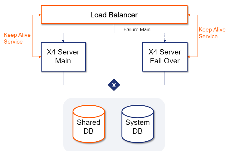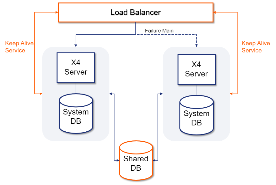 If load balancing and fail over are to be provided through the system structure, each X4 Server requires its own system database. This allows each X4 Server to respond to requests. If only ail over is to be ensured, all requests are redirected to only one of the two X4 Servers.