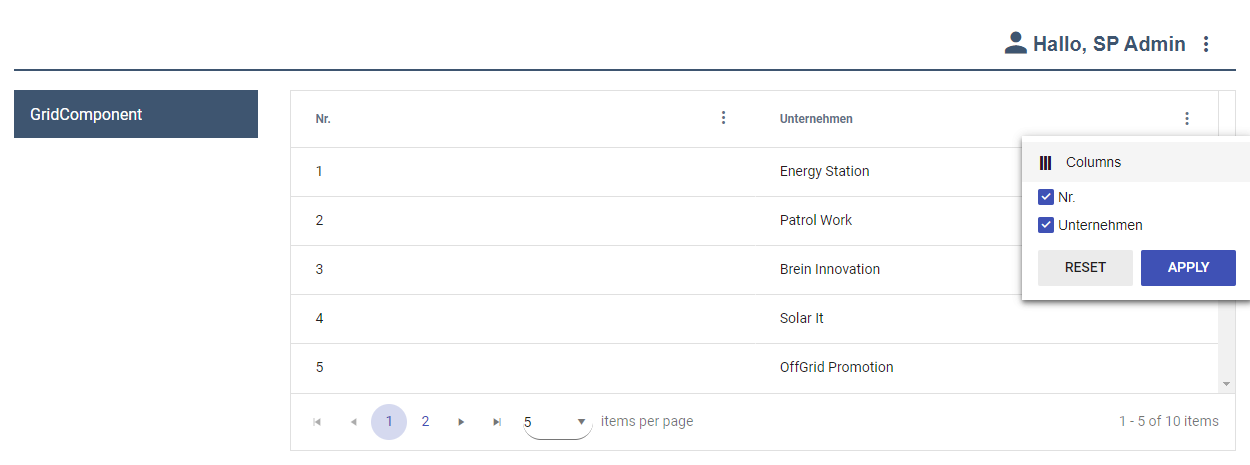 A grid component is ideal for displaying data in a tabular display. In the grid settings, the behavior of the grid component can be defined by setting individual elements.