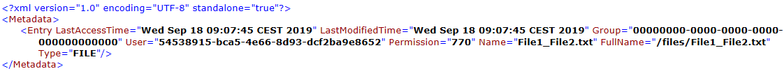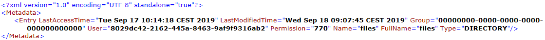 Metadatacontains anEntryelement with the following attributes:Group: ID of the group owning the file or folder.User: ID of the user owning the file or folder.Permission: Unix-style permissions string for this file or folder.Name: Name of the file or folder.FullName: Complete path of the file or folder.LastAccessTime: Time of the last access to the file or folder.LastModifiedTime: Time of the last modification or folder.