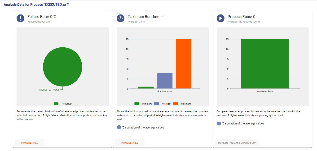 Shows process-related analysis data like failure rate, maximum runtime and number of process runs. Note: For additional information, select More Details. | |