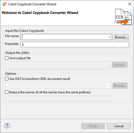 With the COBOL Copybook Converter Wizard you can convert a text file in COBOL Copybook format into an XML document and apply an XSLT transformation of the XML data in the same step. If all names have the same prefixes, you can also reduce all names with the same prefix in the result XML document.
