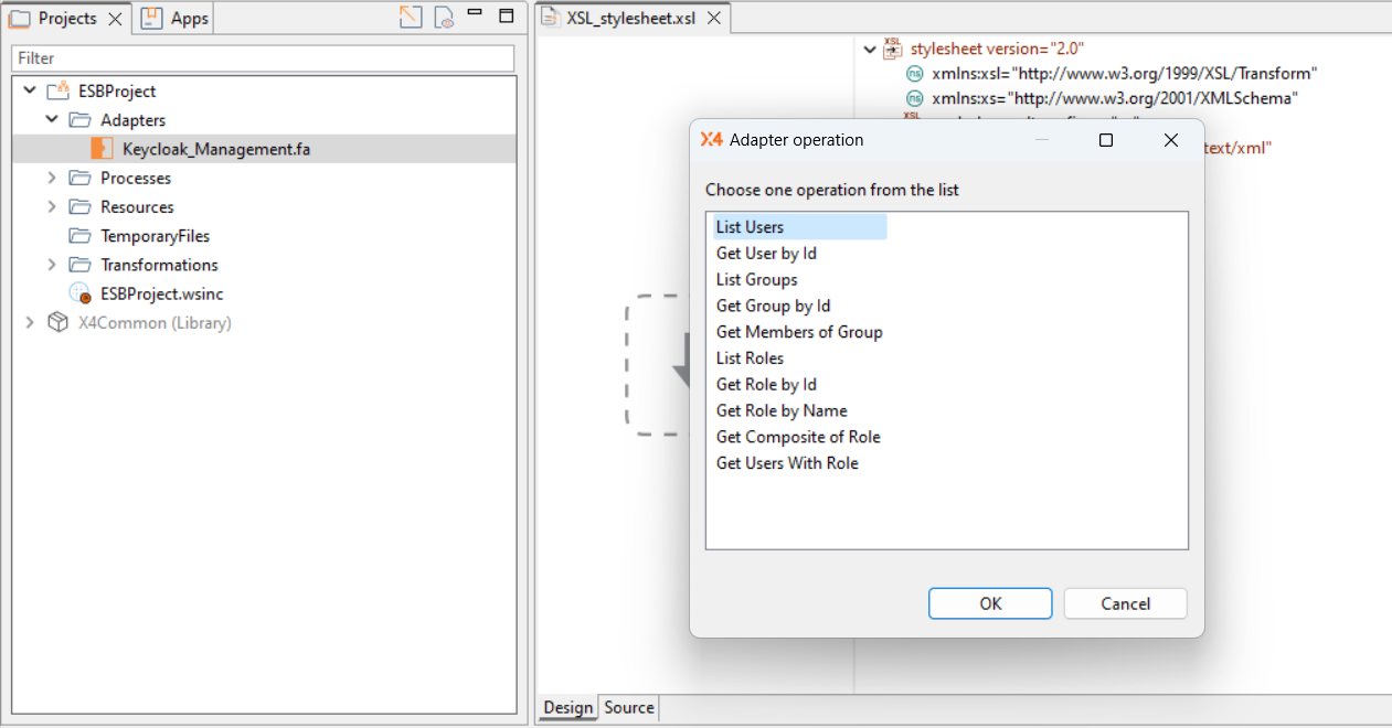 a. For using the XML output of an adapter operation, drag and drop an adapter that is used in a process in the source document pane of the XSL mapping. b. For using the input of an adapter operation, drag and drop an adapter that is used in a process in the stylesheet pane of the XSL mapping.