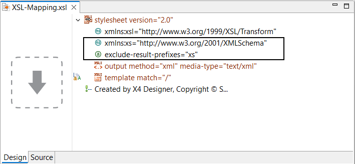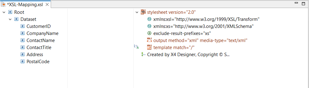If you already know the XML structure to be generated by the XSL mapping, you can assign an XML document or XML schema from the Projects view to the stylesheet pane via drag-and-drop. This structure can be used as target structure for your mapping.