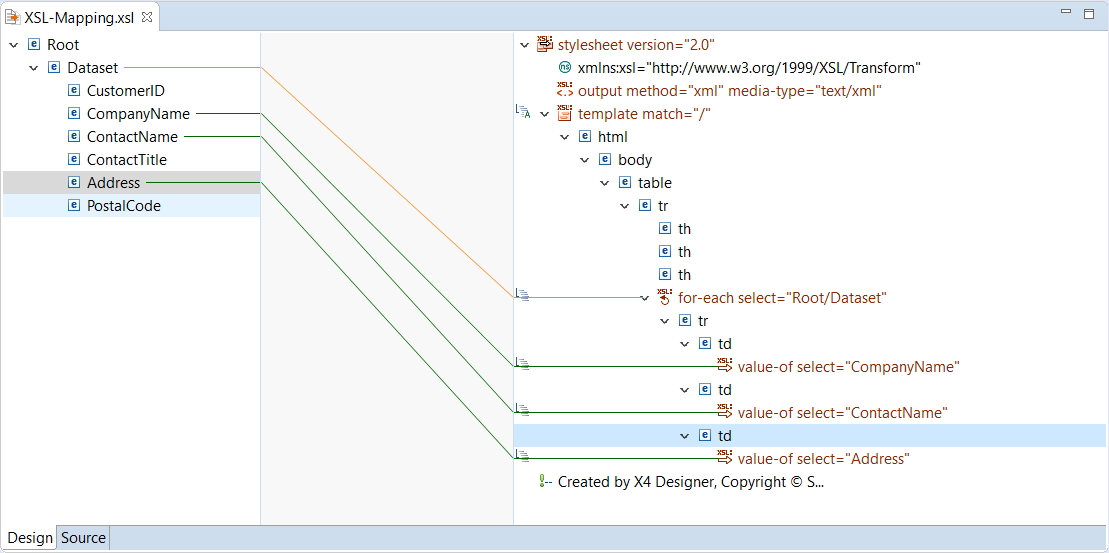 Click the source node and connect it with the target node via drag-and-drop. Example: Connect the <CustomerName> element with the first <td> element, the <CompanyName> element with the second <td> element, and the <Address> element with the third <td> element.