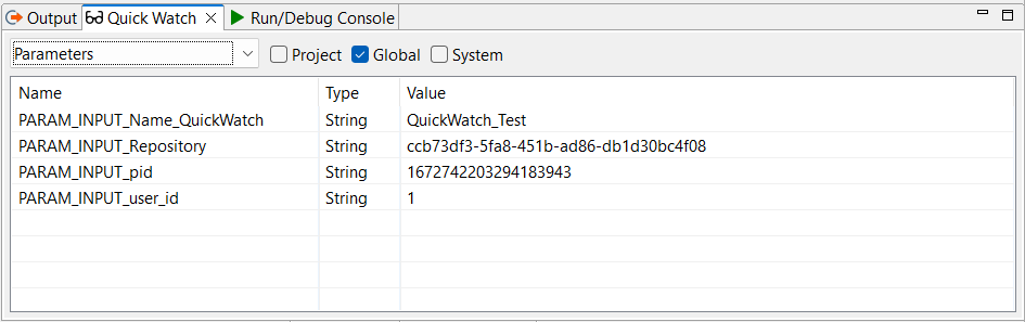 When you debug a process that contains a custom adapter, the Quick Watch view also displays the input parameters of the custom adapter. You can recognize the input parameters by the PARAM_INPUT prefix before the parameter name.