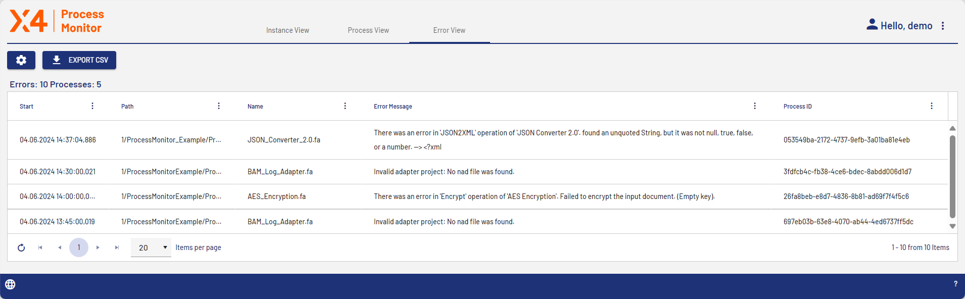 On the Error View tab, all process steps with errors are displayed in an overview.
