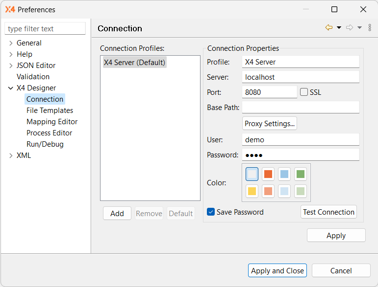 Server IP address or host name of the X4 Server (example: localhost)Port Port number Base Path Base URL for the connection to an X4 Server behind a proxy Proxy Settings Default settings for proxy servers and your Internet connection User Name of the Repository user Password Password of the Repository user Color Color for the connection setting (optional)