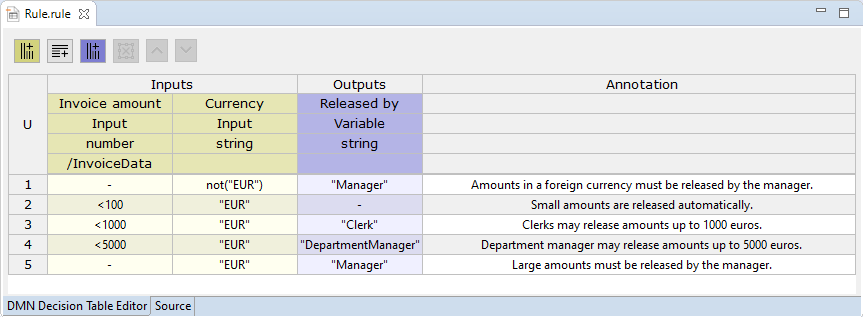 .rule) are used to store the rules to assign the task to the appropriate person depending on the amount. The input specifies where the data to be checked comes from. Via Case Feature the previously defined features (see Managing Business Process Data) are specified.Decision tables can also be used to evaluate variables, features, parameters or status values (Case State). To do this,
