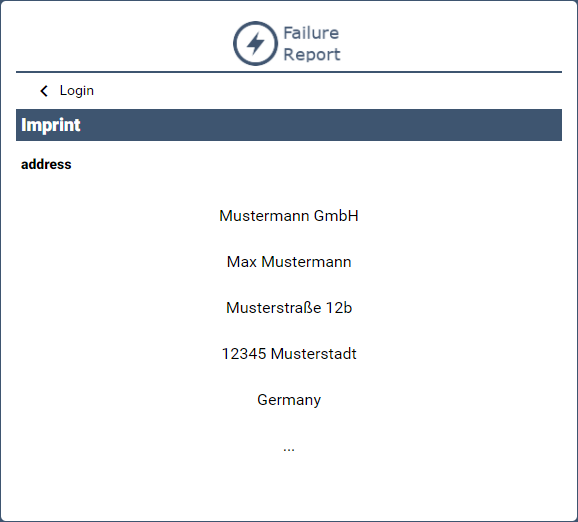 A link to the imprint is displayed on the login page and on all pages within the web application. The link is only displayed if there is an .imprint file within the Web App project.